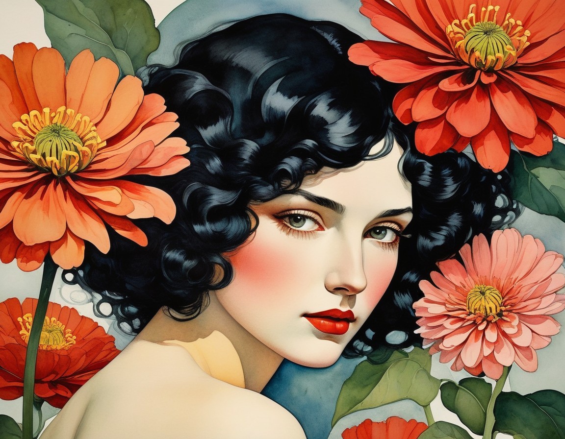 Beautiful woman emerging from a zinnia flower in the style of WALTER MARTIN BAUMHOFER and rené gruauwhimsical, beautiful, poignant, touching. colors, black. soft watercolor extra water in Art Deco by Annigoni, Egon Schiele, Milo Manara, Botticelli, Catrin Welz-Stein, Jean Metzinger, Klimt, perfect eyes, perfect hands face , highly detailed, complementary colors, hyper detailed. Watercolor and ink splatter, dynamic pose,