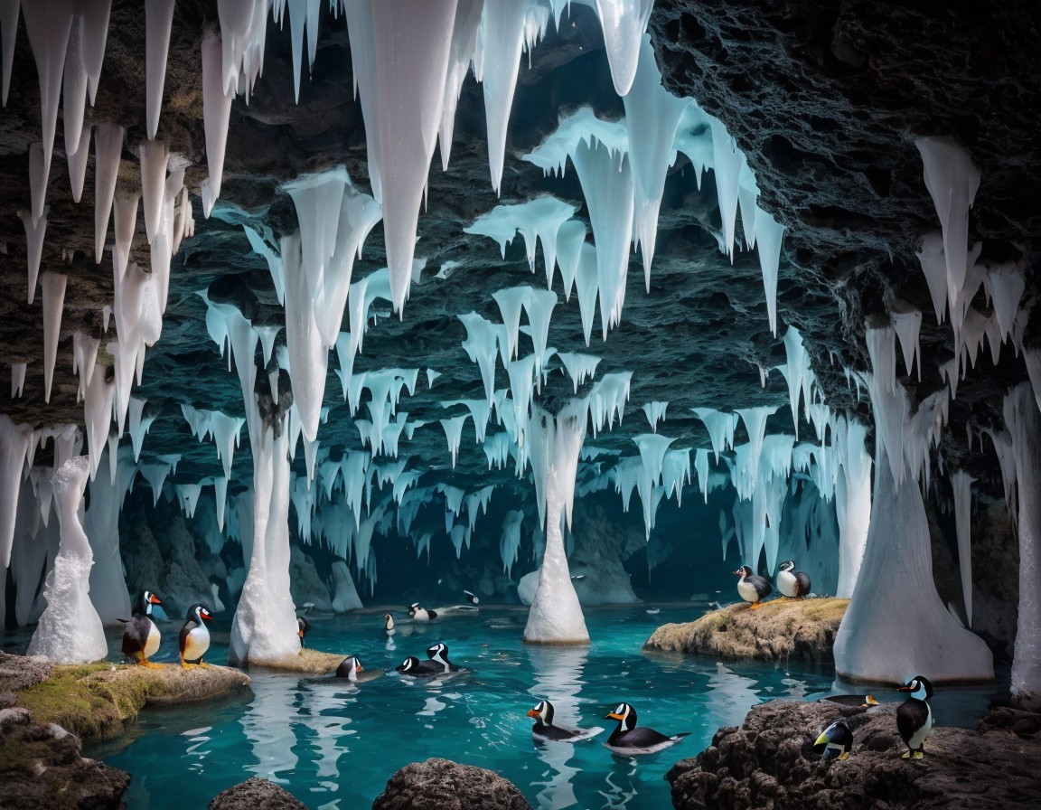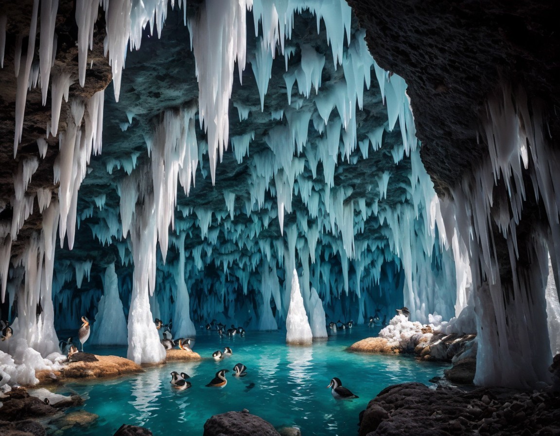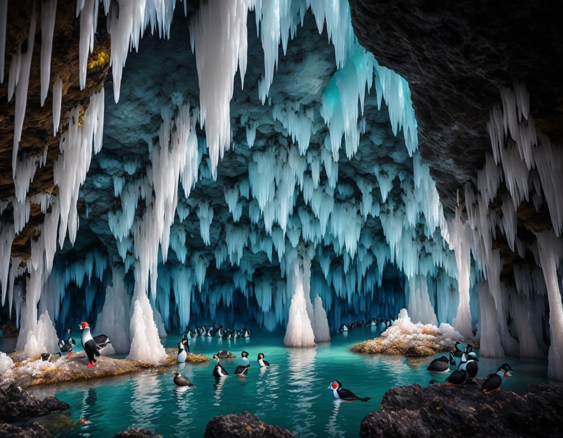 Icy Cave with Blue Light and Puffins on Rocks