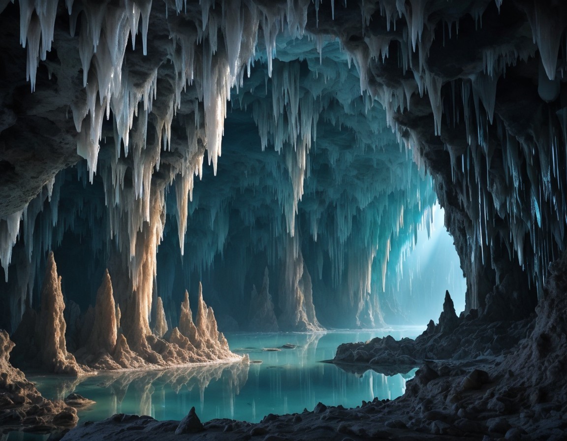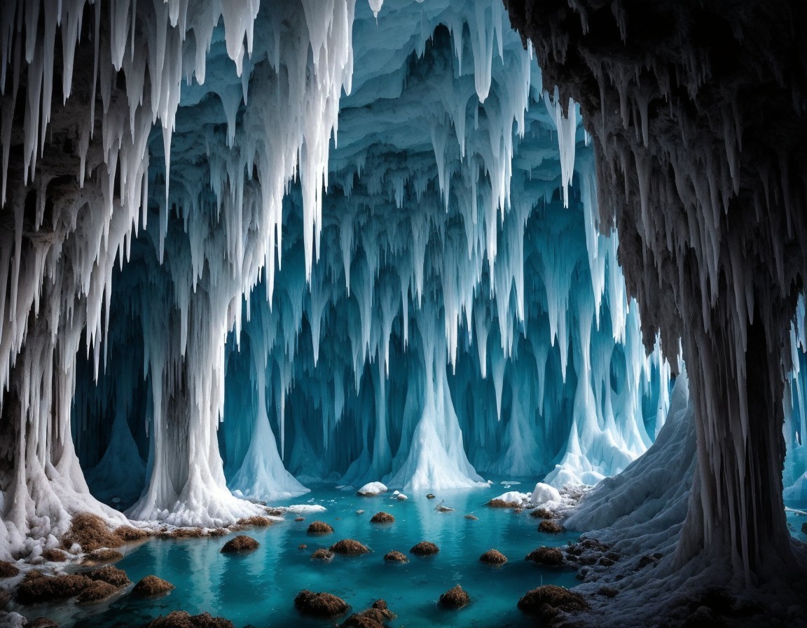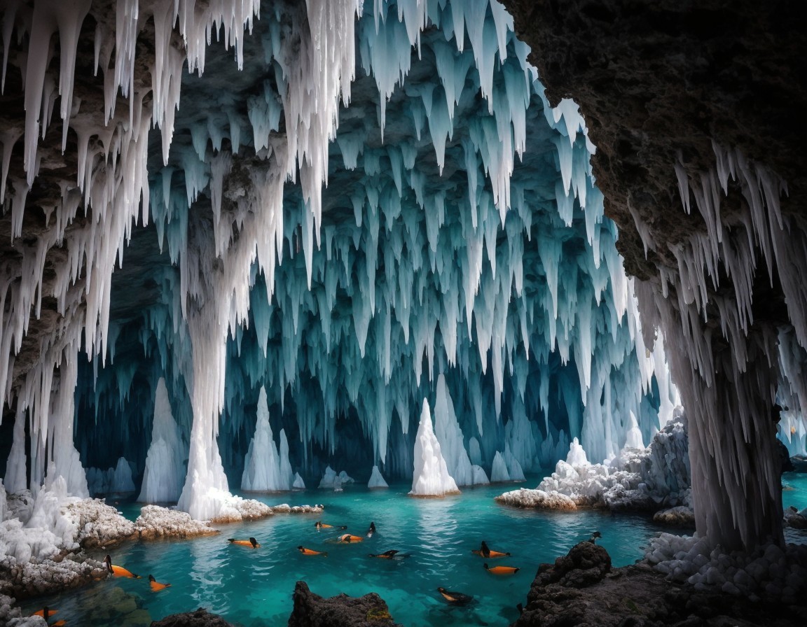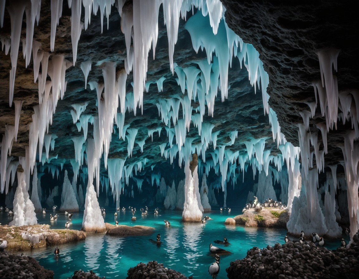 Icy Cave with Blue Light and Puffins on Rocks