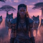 A mystical warrior stands confidently in a twilight landscape, surrounded by four wolves. The scene is vibrant with purple hues, evoking an adventurous, magical atmosphere.