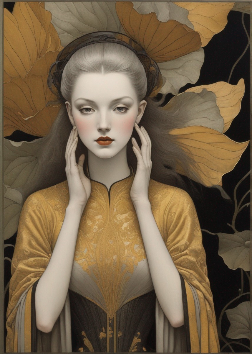 An artwork featuring a pale woman with red lips, wearing a golden headdress and dress, surrounded by large leaves.