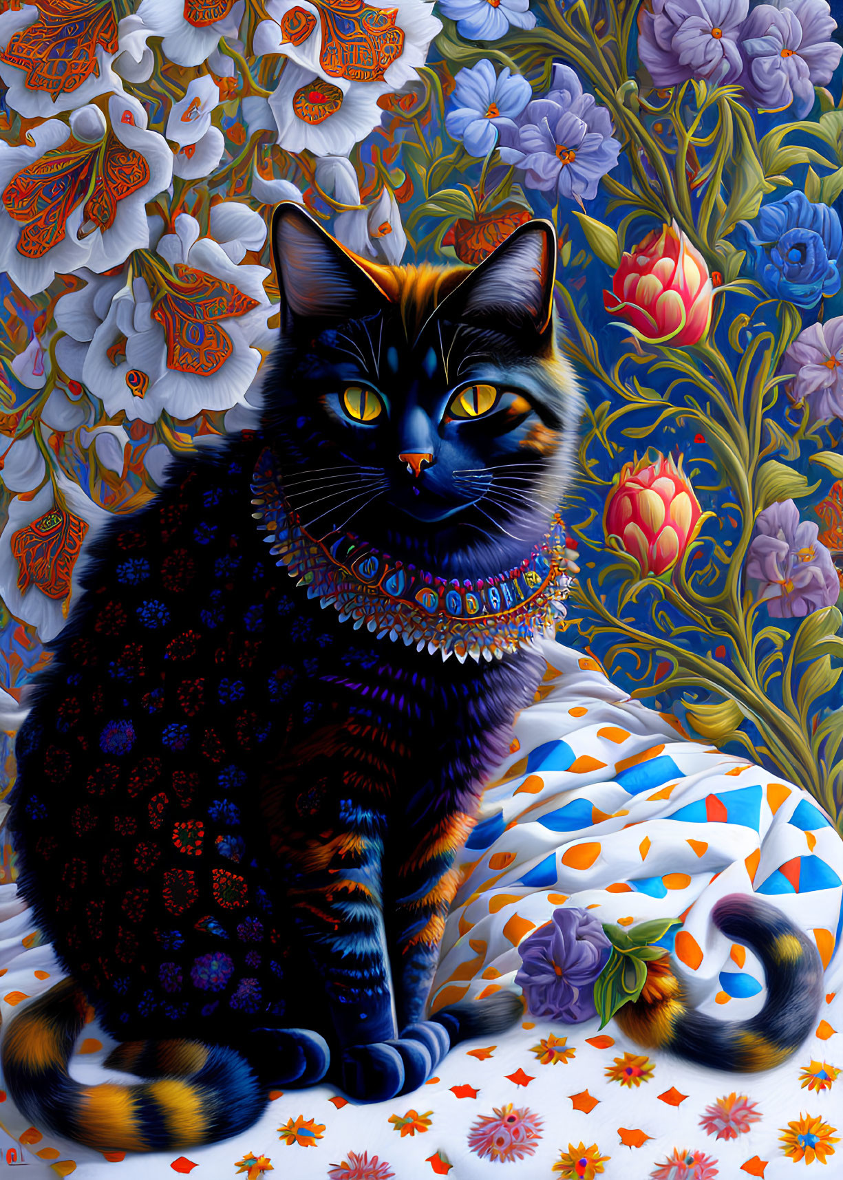 Fantasy harlequin cat with a plate of flowers, by Louis Wain, by Catherine Abel, by Gediminas Pranckevicius, fantasy, oil on canvas, beautiful, high details, ultra detailed, crisp quality, colourful, high definition
