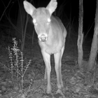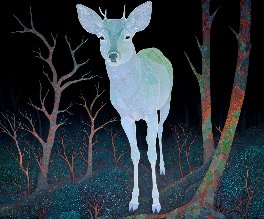 A stylized deer stands amidst a dark forest, its body composed of geometric shapes. Surrounding trees are bare, creating a mysterious and surreal atmosphere in vibrant hues.