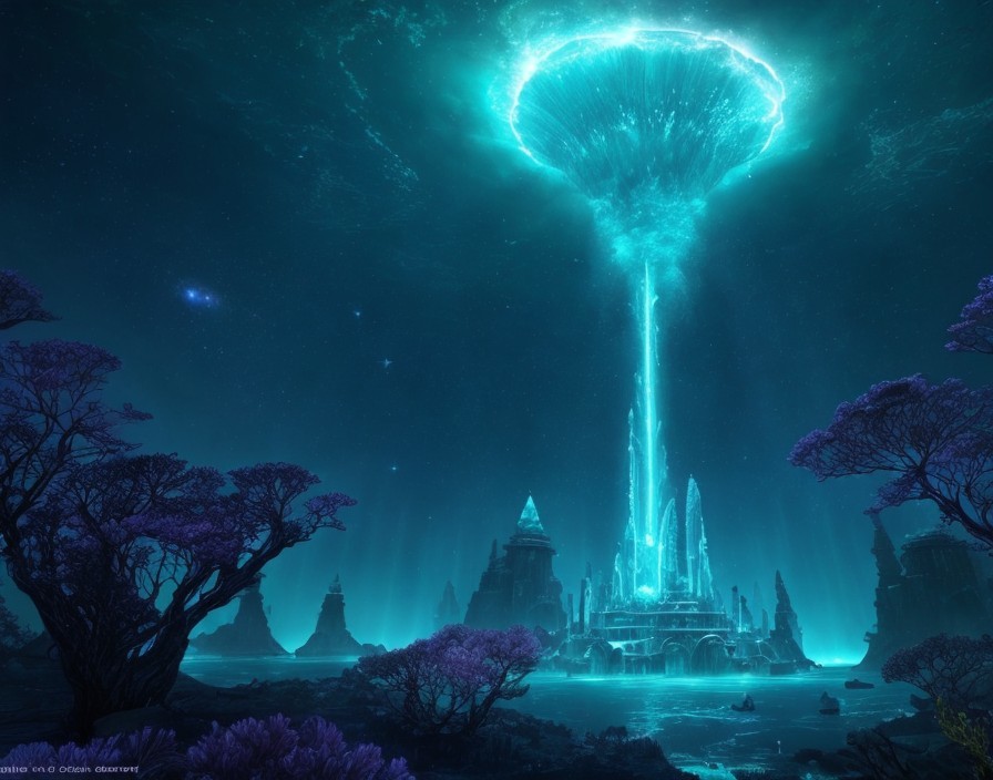 Prompt: Create a digital dreamscape that merges an underwater city with celestial elements. Visualize a submerged ancient city, akin to Atlantis, with intricate, glowing buildings and surreal architecture. Intertwine this with cosmic features: nebula-like colors in the water, starry skies visible through the clear ocean above, and bioluminescent marine life that resembles galaxies and constellations. Add an ethereal glow to the entire scene, giving it a mystical and otherworldly feel. The color palette should be rich in deep blues, purples, and iridescent tones, with hints of gold to accentuate the majesty of this underwater cosmos. Aim for a balance between the mystical depths of the ocean and the boundless beauty of the night sky, creating a seamless fusion of these two realms.