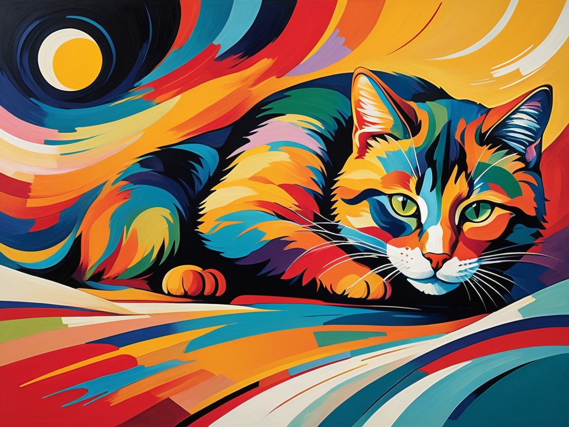 Prompt: "Vibrant brushstrokes, warm contrasting colors, emotional atmosphere, geometric transformation, lively and expressive, essence of a cat, immersed in visual energy flow, emotional landscape in motion, abstract interpretation, surreal elements, dynamic composition, bold and vivid hues, textured details, expressive strokes, modern art style, evocative and captivating, by Wassily Kandinsky, high-resolution artwork, Artstation."