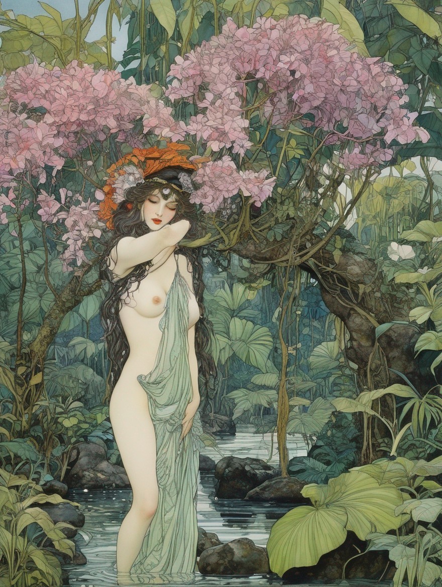 An ethereal woman clad in a flowing seafoam dress amidst a tranquil, tropical forest at twilight.