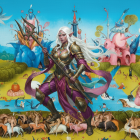 Two ethereal figures with long, flowing hair and ornate clothing gaze serenely, surrounded by fantastical landscapes, shimmering bodies of water, and floating islands under a vibrant sky.