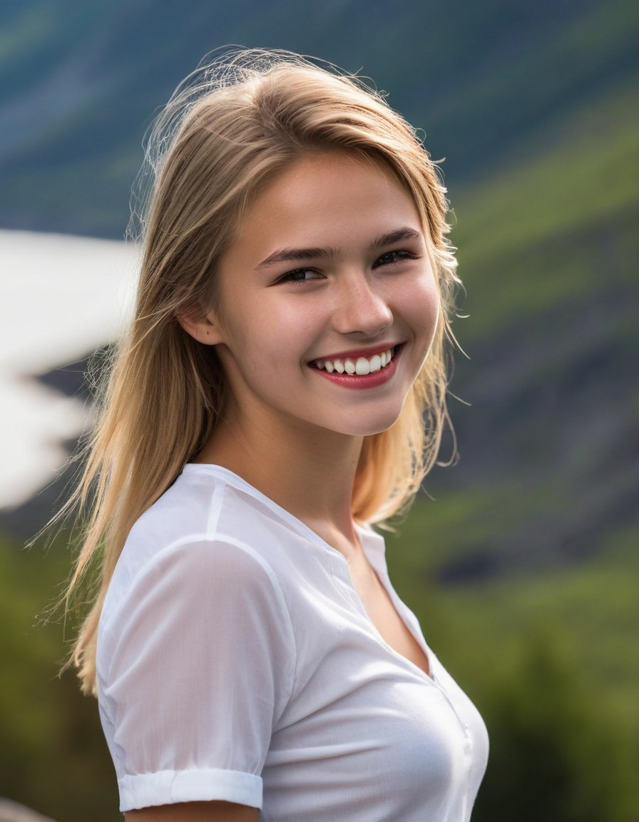 Prompt: "(masterpiece, best quality), (colorful), cinematic lighting, realistic, dynamic pose, extremely detailed, beautiful detailed face, an extremely delicate and beautiful 18yo Norwegian girl, side view, outdoors, slim, wearing a tight seethru white shirt, red skirt, upskirt, 18 years old, smile, white teeth, perfect teeth, (extremely detailed face, beautiful eyes, detailed eyes, symmetric eyes, seductive eyes, slim face:1.3), (eyeshadow, makeup:1.2), big round glasses, sitting on a fence with a quiet lake among crags in background, knees wide open, betweenlab, black thong wedged in vulva, spread_legs, pussy, split_legs, detailed face, intricate detail, masterpiece, <lora:skirtlift-v4:.8>, 8k, hi res, dramatic lighting, skin pores, top buttons undone, lifting dress, floor shot, pigtails, plaits, blonde hair, freckles, grinning, erect nipples, dark big areolas, intricate detail"