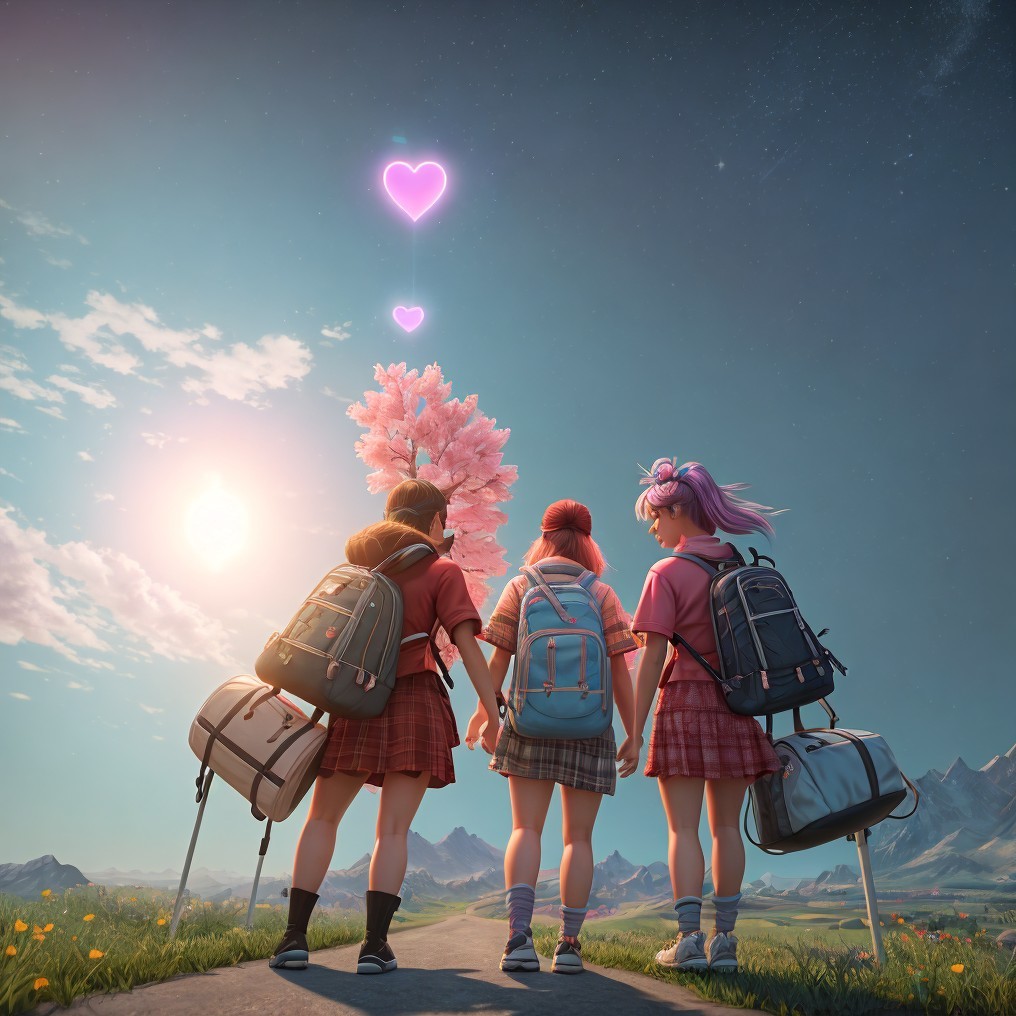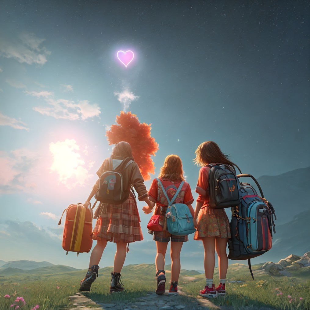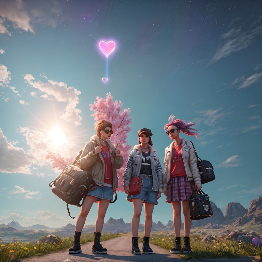 Three friends admire heart-shaped cloud in surreal sky with urban skyline.