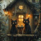 A cozy snow-covered village scene features wooden houses with glowing windows. Three playful black cats lounge outside, while soft snowfall creates a magical winter atmosphere.
