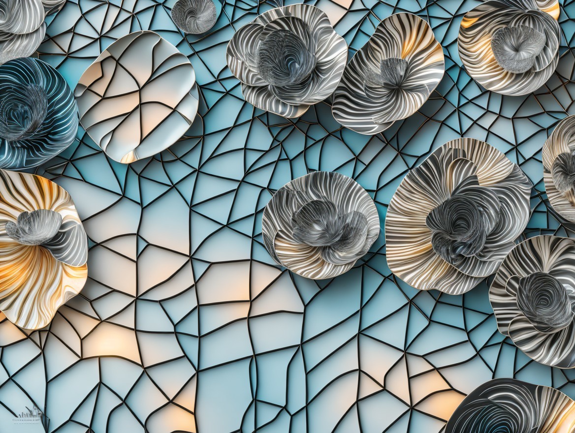 An artistic wall with circular patterns, some with spiraling designs, nestled within a dark-lined geometric grid.