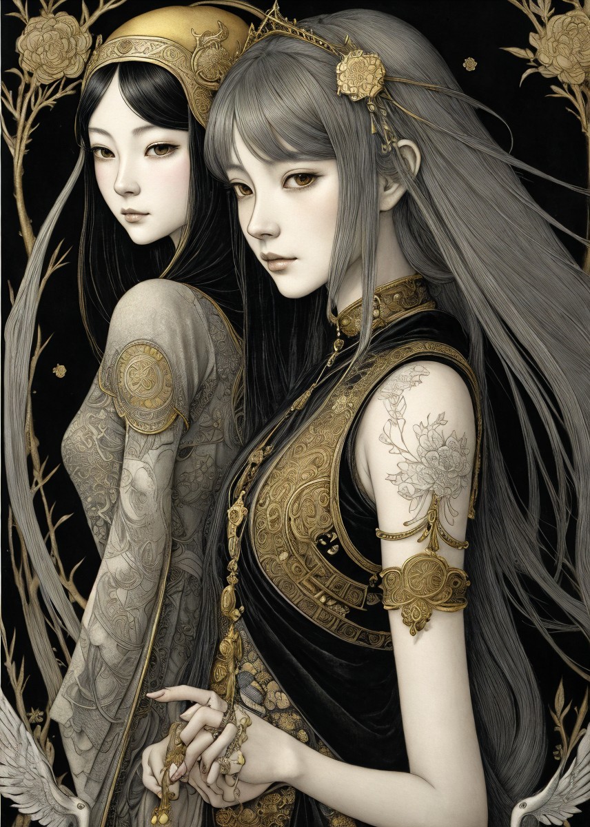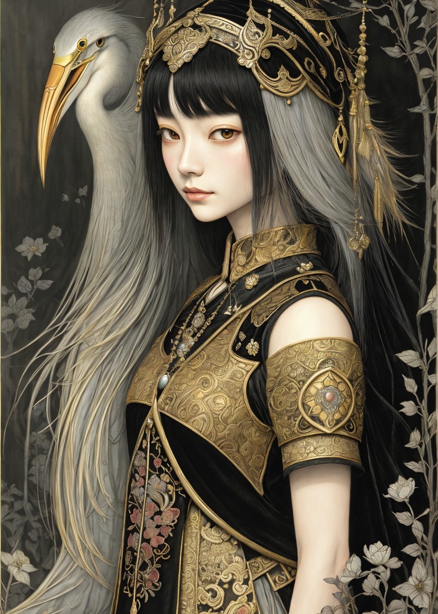 Legend of the Girl and the heron, Medieval Japanese Artists Sumi-e Style, Velvet Black, Shabby, Dull Gold, Amber Gray, Golden Ratio, Surreal Fantasy, Elegant, High Definition Ultra Fine 3D Line, Zenangle Style, Watercolor Patchwork , Arthur Rackham Style, Paul Kidby, Gediminas Prankevicius, Jacek Jerka, Extremely Detailed, Intricate, Thoughtful, HDR, Fractal, Beautiful, Award Winning, Fantasy Look, Fantasy, Crisp Quality