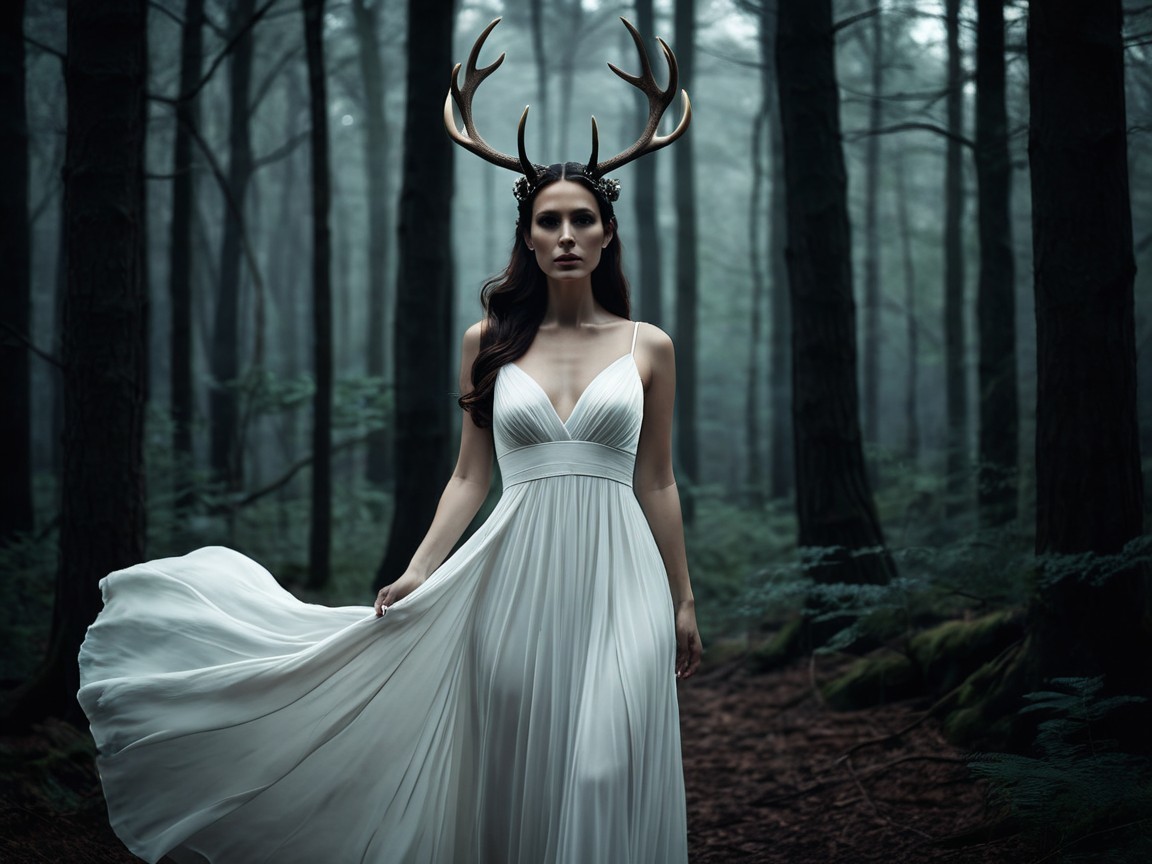 A woman in a flowing white dress stands in a misty forest, adorned with antler-like headpieces. The scene is ethereal, blending elegance with a touch of the mystical.