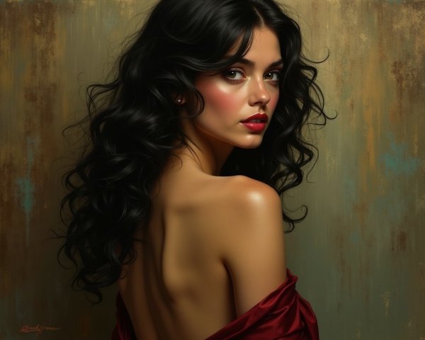 portrait of splashes and blots of paint and ink of a sensual girl, turning her back with openwork antique gold and sparkling amber jewelry, intricate openwork background, amber red, silver, gold, 3D, Shabby, Surreal fantasy, 3D Zenangle Style, Watercolor patchwork quilt, Style Arthur Rackham, Paul Kidby, Gediminas Prankevičius, Jacek Jerka, watercolor pen and ink by Yoshitaka Amano, 3rd century Persian miniature, crescent Author "anime", 3D anime art inspired by WLOP, Artstation, genshinimpact pixiv, extremely detailed, aesthetic, concept- art, ultra-fine detail, stunning, 8k resolution, vray tracing, Create a portrait of a feminine entity with soft porcelain-like skin and strikingly vivid green eyes. The hair should be long, wavy, and black with teal highlights, cascading over the shoulders and adorned with an assortment of flowers including yellow flowers, violet petals, and various complementary flora. The hair is partially styled up with loose tendrils framing the face. Accentuating the composition, include an intricately designed golden earring with a circular motif in the subject's visible ear. The background showcases a complex mandala pattern filled with ornate details and a Ray Caesar style, Portrait of woman in art pose with Pale buttermilk color butterfly over one of her eyes, in only two colors: Pale Cerulean and Cocoon colors, monocromatico, Very sweet composition, only two colors, centered, symmetry, painted, intricate, volumetric lighting, beautiful, rich deep colors masterpiece, sharp focus, ultra detailed, in the style of dan mumford and marc simonetti, astrophotography, Very attractive, charming, fascinating lady, soft symmetrical face, bright eyes, sexy mouth, striking, dreamy, breathtaking, with a pearl necklace on her forehead, perfect face, spectacular, gorgeous, elegant, masterpiece, by Tom Bagshaw, A detailed illustration of a woman with red hair, ornate jewelry, and a decorative golden headpiece, set against a rich, patterned background.