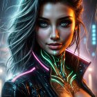 A striking cyberpunk portrait featuring a female figure with glowing neon accents, a sleek jacket, and a futuristic backdrop of vibrant city lights and rain, exuding an alluring, edgy vibe.