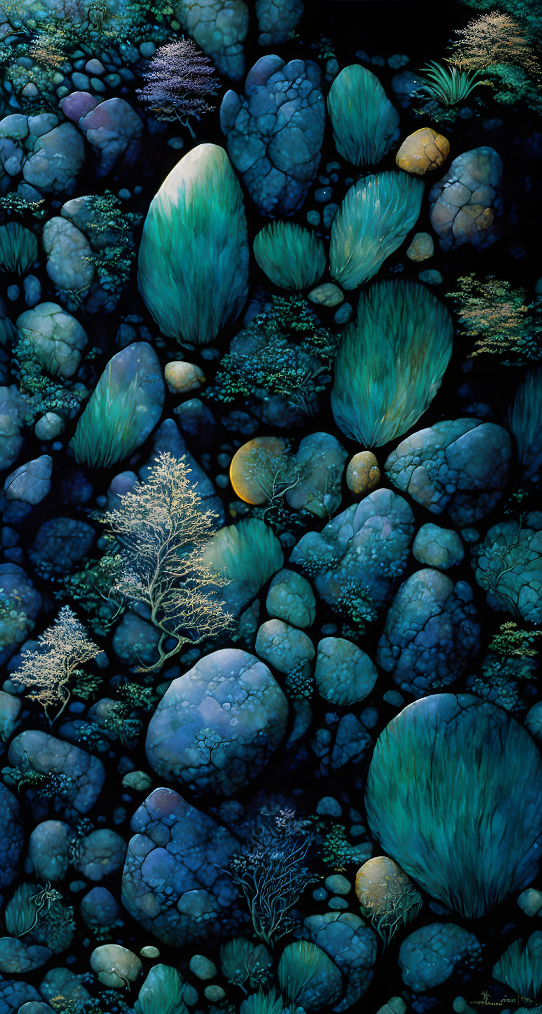 Enchanted pine forest, stream, rocks, grasses, sunset sky