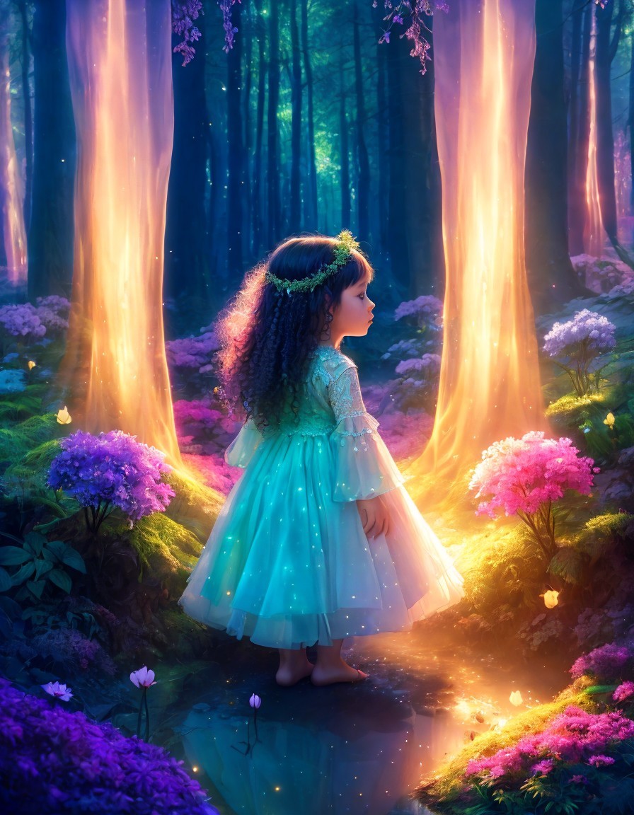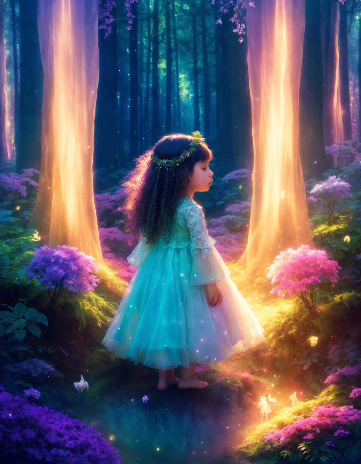 A young girl in a sparkling dress stands in a mystical forest with vibrant flowers and ethereal light shafts.