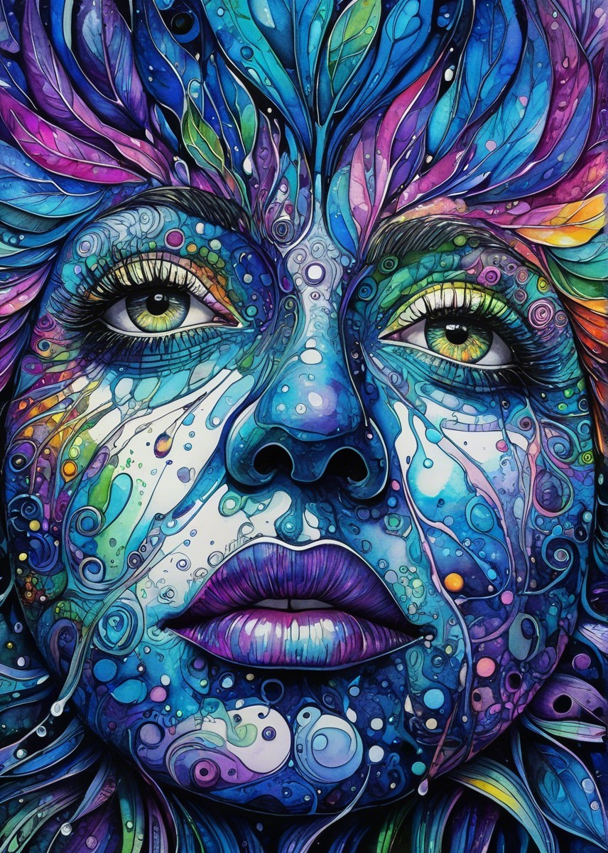 A vibrant, abstract portrait of a woman's face, adorned with swirling colors and intricate patterns. Her captivating eyes and layered textures evoke a sense of wonder and cosmic energy.