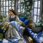 A serene woman in a flowing blue dress sits by a window adorned with plants and flowers, gazing contemplatively outdoors. Rich details and soft colors create a dreamy atmosphere.