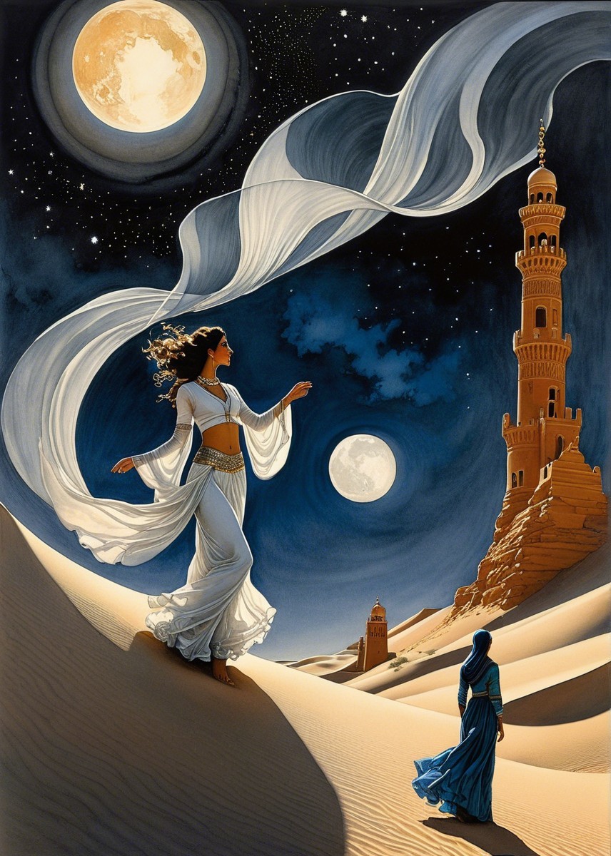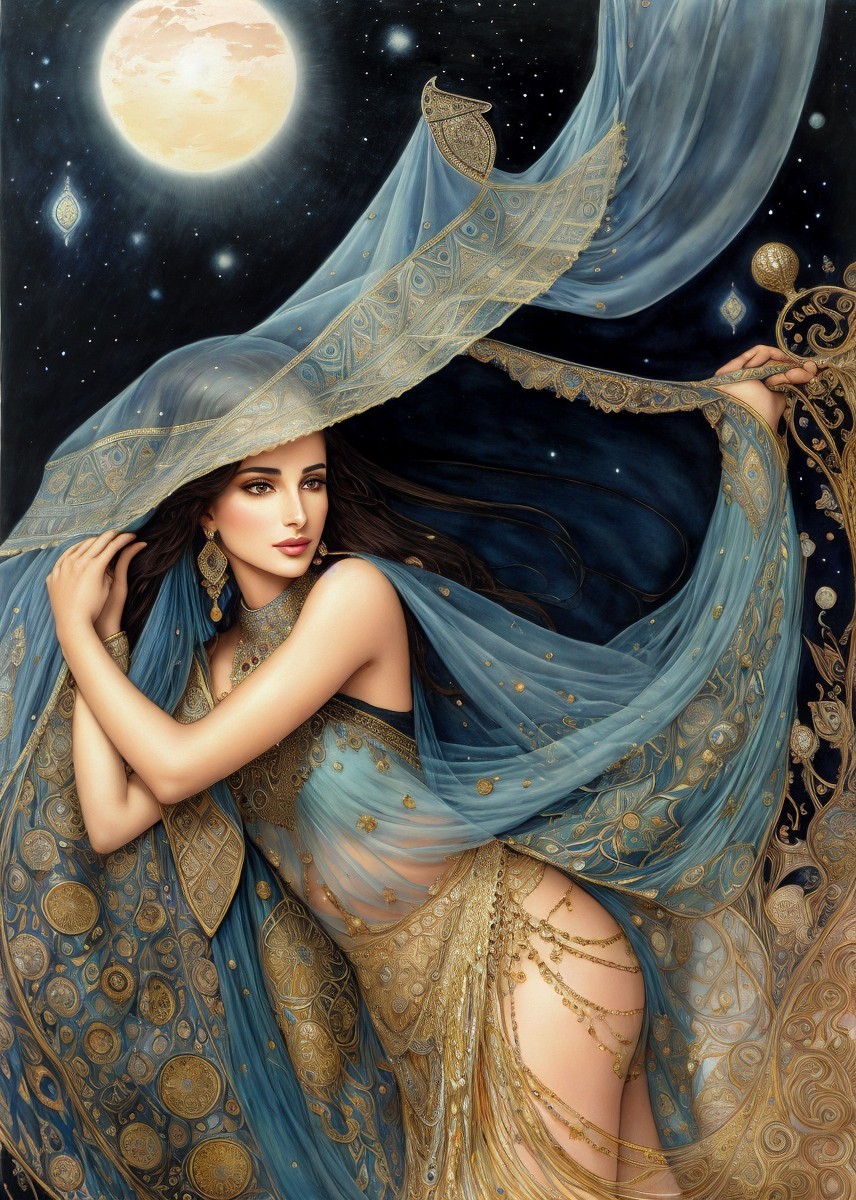 A graceful dancer in flowing fabric swirls against a starry night sky, illuminated by a full moon. Her attire is vibrant, blending hues of blue and gold, evoking an enchanting, mystical aura.