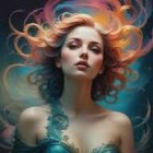 A striking portrait of a woman with flowing, vibrant orange hair, highlighted by a shimmering teal dress, set against a swirling, colorful background that evokes a mystical atmosphere.