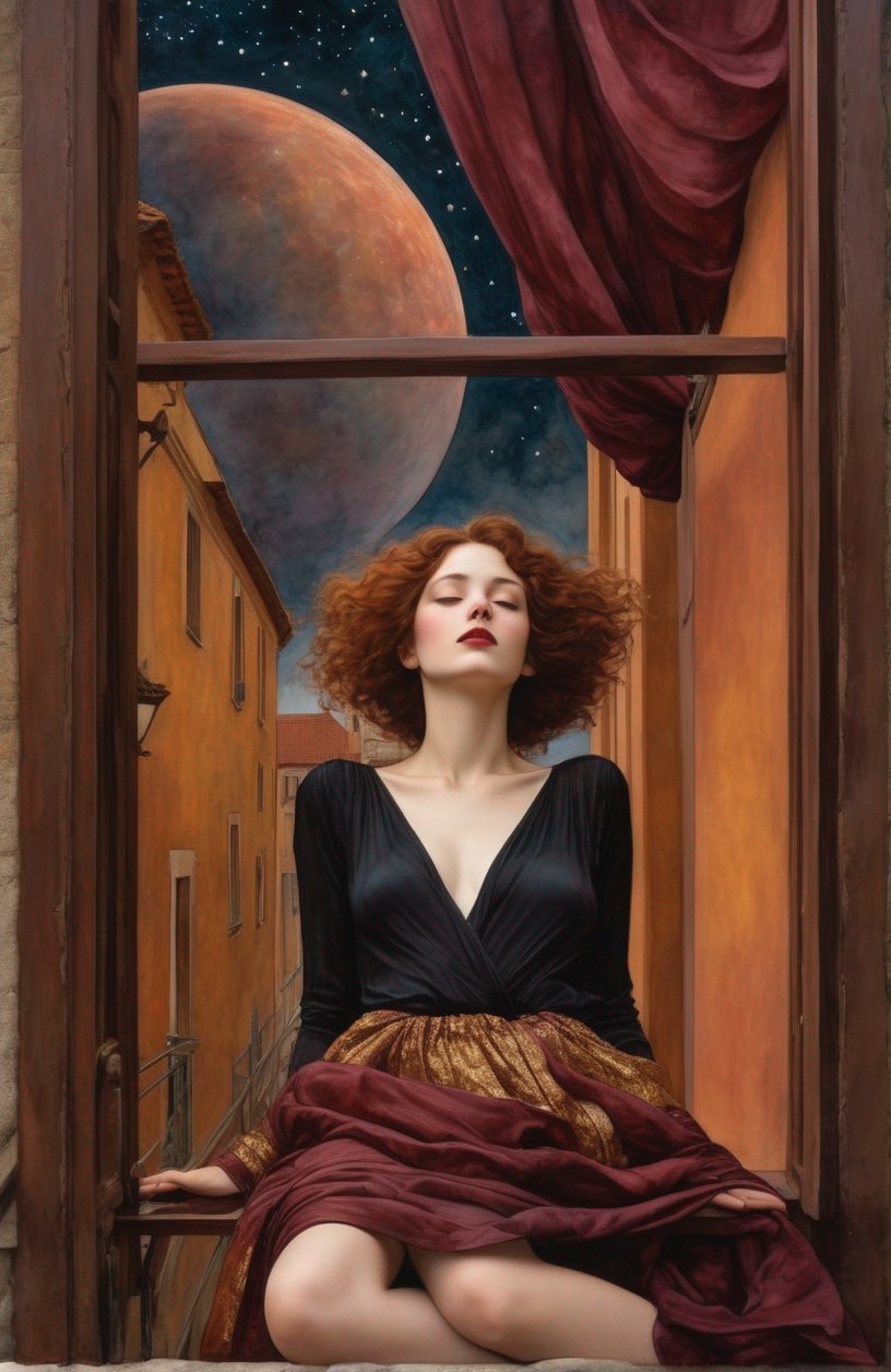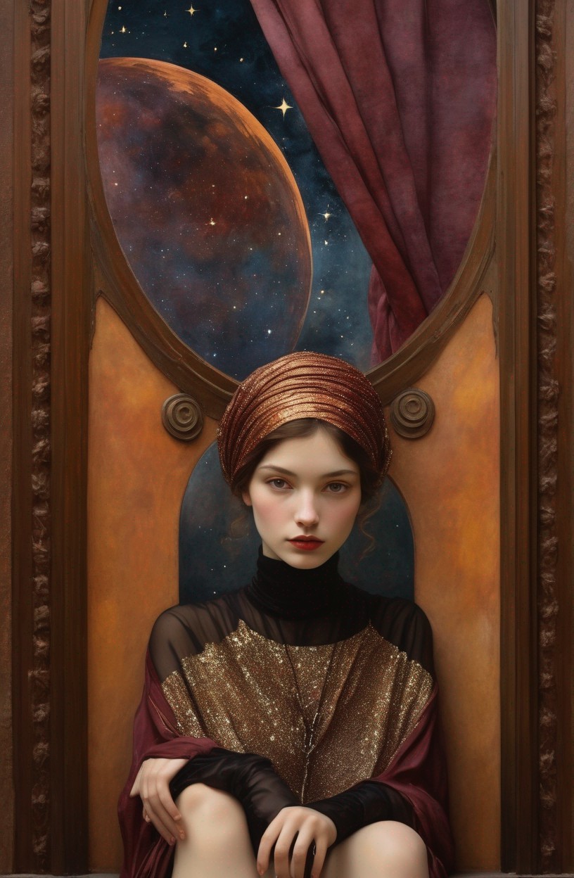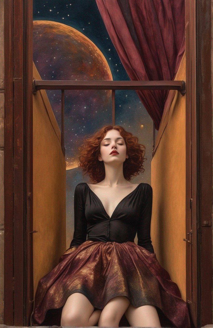 + Prompt:She wasn’t doing a thing that I could see, except standing there leaning on the balcony railing, holding the universe together., whimsical, beautiful, poignant, touching. colors rose, gold, rust, burgundy, black.