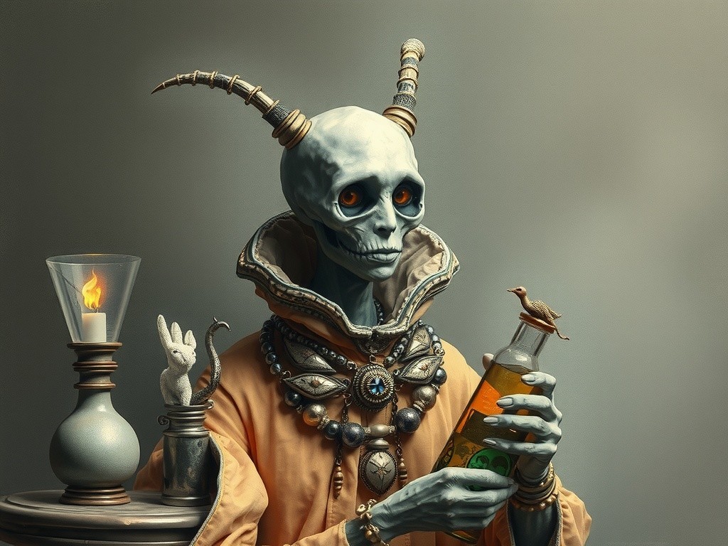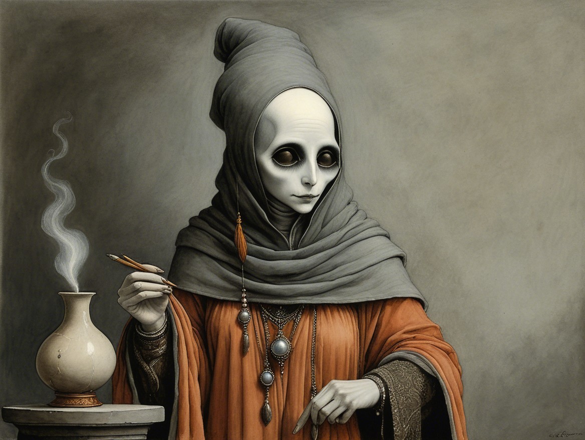 A woman in a gray cloak sits on an old suitcase, accompanied by a snowy owl and a cloaked figure, under a muted full moon.