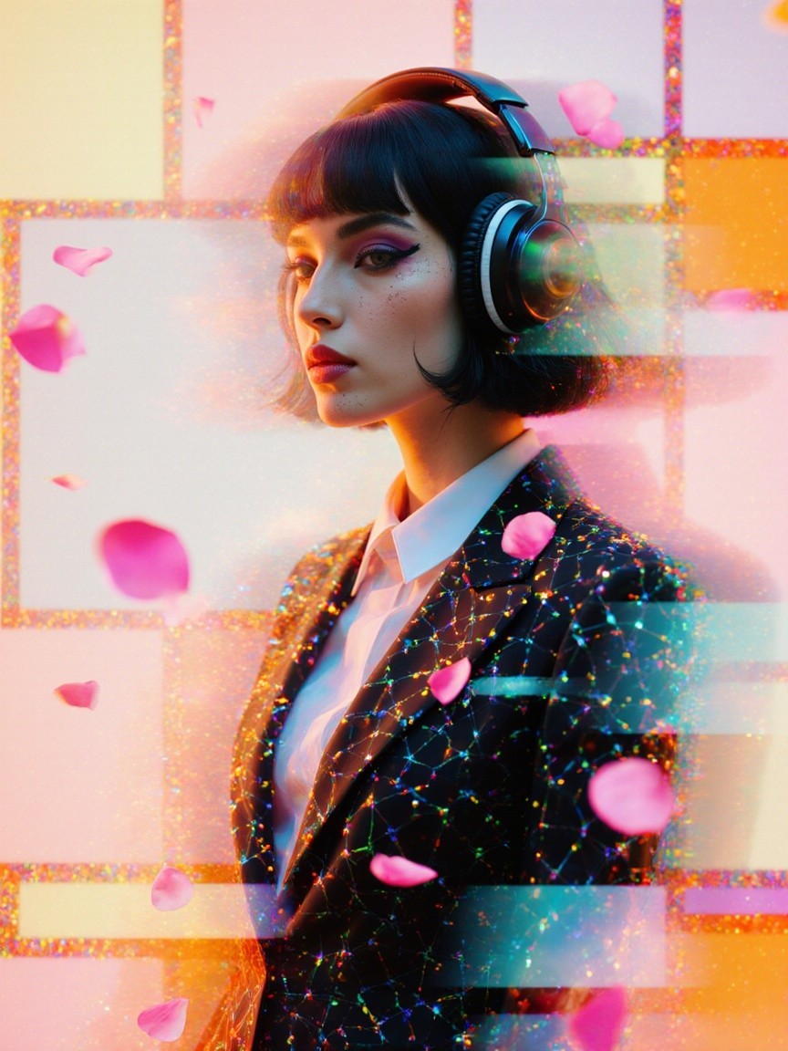 Prompt: "Extra gritty, cringe, transgressive, with subsurface scattering, multiple exposures, and overlapped images, creating a hypnotic, blurred, and ghosting effect! A strikingly beautiful woman in a geometric, fractured suit of neon and pastel planes, resembling a living Mondrian painting, with headphones crowning her head. Music's influence is visualized as flowing lines and vibrant rhythm across her form and the background, which glows with pastel and orange blocks like a pop art canvas. Pink petals drift gently through the air, softening the sharp geometry. The style is a whimsical, surrealist-inspired portrait blending elements of couture and electro-pop, with hypnotic pointillist-inspired details and shimmering, luminous colors, reminiscent of René Magritte and Georges Seurat, evoking the drama of Marseille Tarot's La Maison Dieu and the fantastical, elongated creatures and melting forms of Devilman Crybaby."