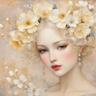 A delicate portrait of a young woman with curly blonde hair adorned with large white flowers. Soft pastel tones and golden accents enhance her ethereal beauty and serene expression.