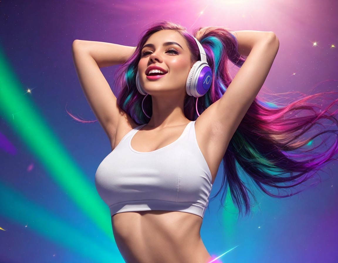 Prompt: "Popart - a buxom woman wearing a white crop top and headphones dancing ecstatically to music... Overhead lighting very long hair waving in the breeze... blue, green, purple, red, and pink hues... sense of energy in the painting... dancing with arms in the air... joyful, happy expression kaleidoscopic background highly detailed digital painting with elegant intricate cinematic lighting very attractive dynamic lighting award-winning hdr acrylic art David Hockney Edgar Degas Yossi Kotler Henry-Pierre Picou GIAN LORENZO BERNINI"