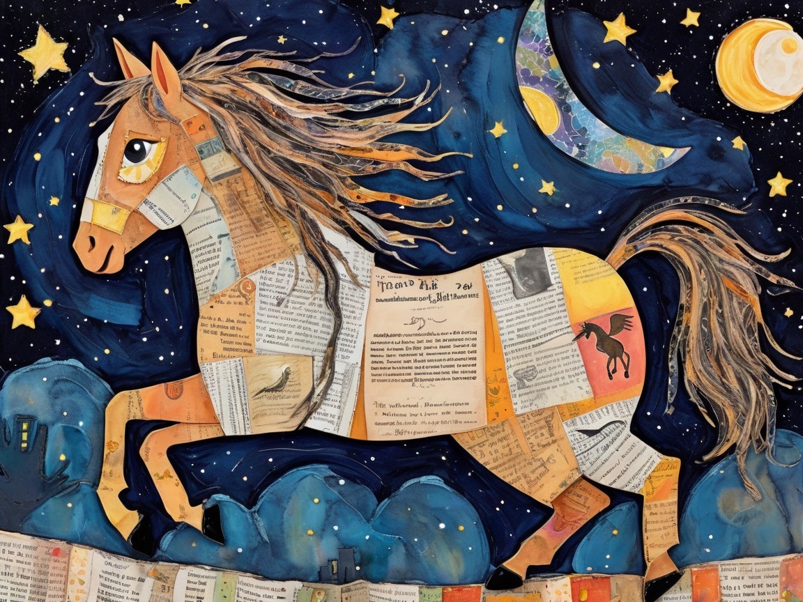 A whimsical, artistic horse gallops through a starry night, its body adorned with pages from books. Swirling clouds and a crescent moon create a dreamy backdrop in vibrant colors.