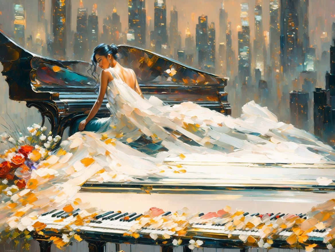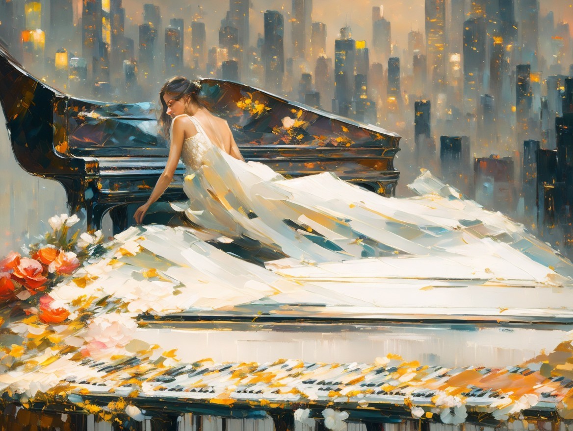 Prompt: Oil painting of a stunning woman in a serene and captivating scene. She is gracefully playing a piano on a rooftop against the backdrop of the night sky and illuminated solitaires, with the city lights twinkling below. Heavy brush strokes and paint splashes by Jeremy Mann, Carne Griffiths, and Robert Oxley. Rich and deep colours. Award winning, professional, intricate details. Volumetric lighting, gorgeous masterpiece, sharp focus, dof, 8k.