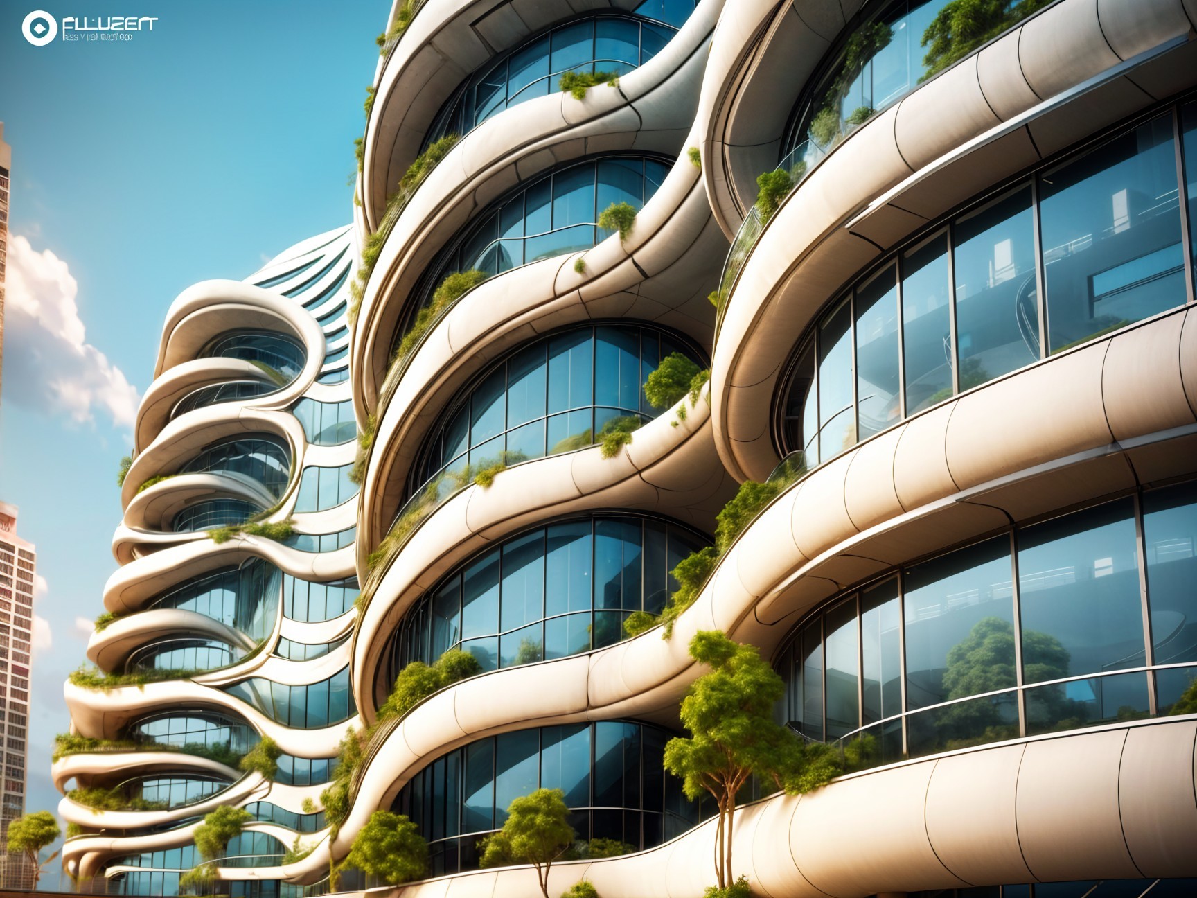 A futuristic building features a flowing, organic design with smooth curves and large glass windows. Green plants are integrated into the facade, creating a blend of nature and modern architecture.