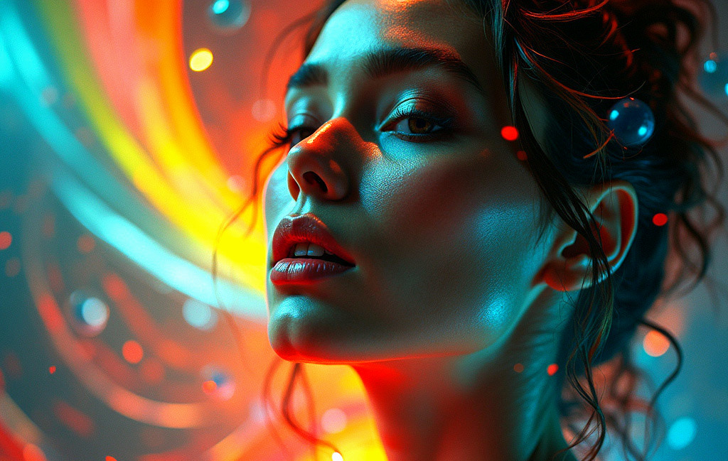 A close-up portrait of a woman with glowing skin illuminated by vibrant, swirling colors. Her wet-look hair and striking features create a captivating and ethereal atmosphere.