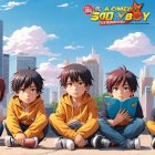 A colorful paper-cut scene shows a smiling woman with two boys and a younger child, under umbrellas in a park with buildings in the background. It's a cheerful, playful illustration.
