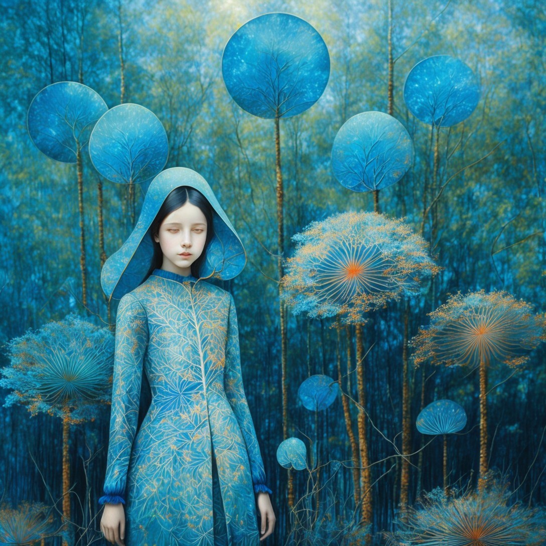 A serene girl in a vibrant blue dress stands amidst a whimsical forest filled with fantastical, oversized blue flowers and glowing orbs, creating a dreamlike, ethereal atmosphere.