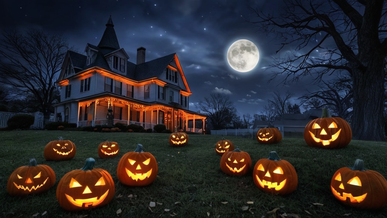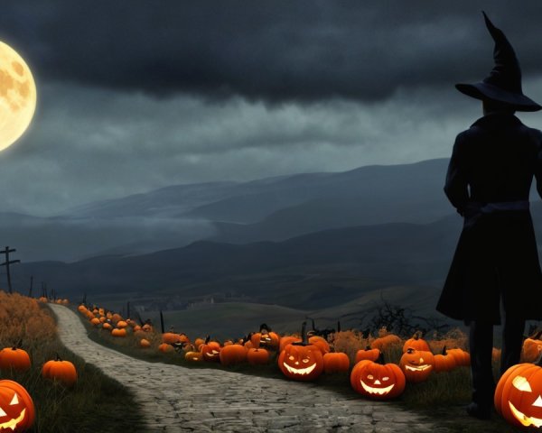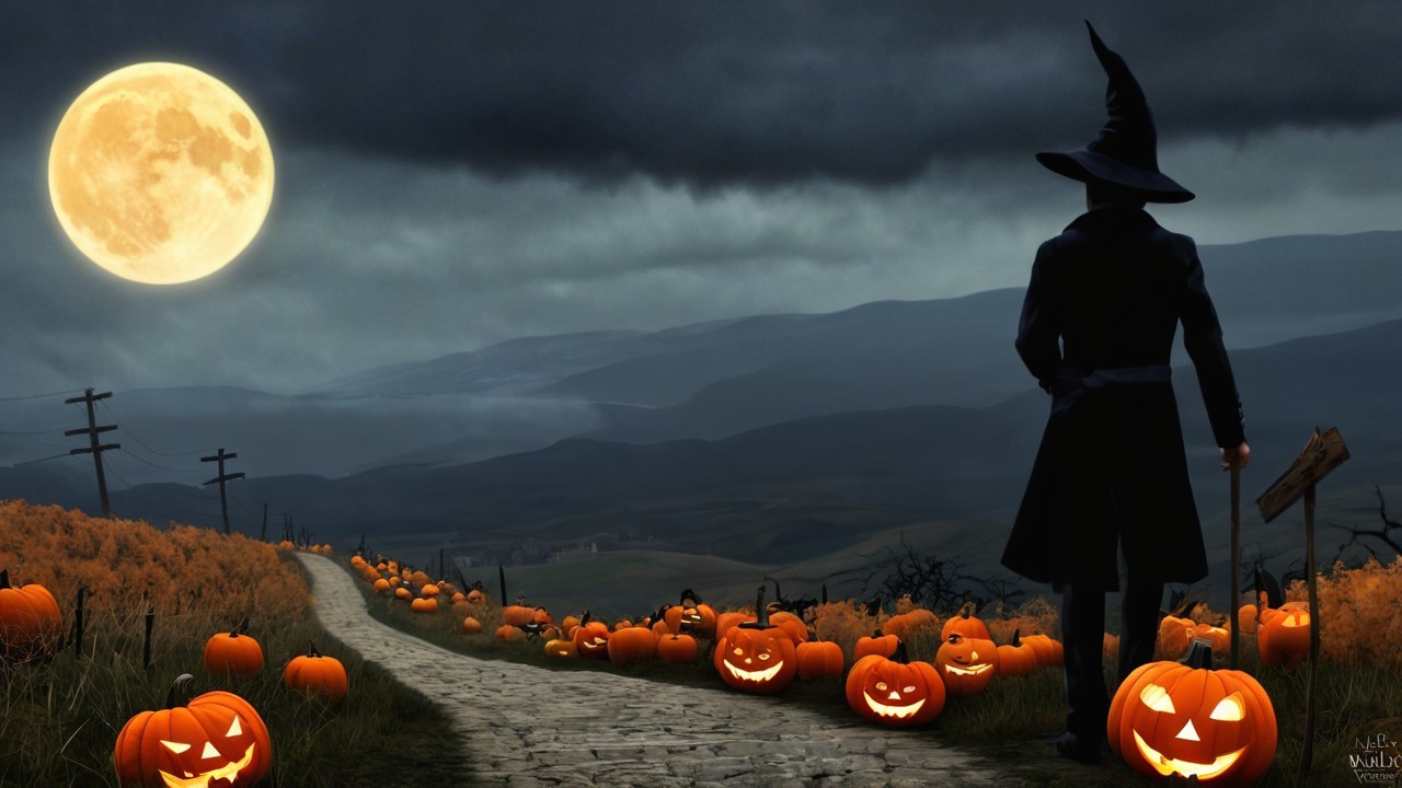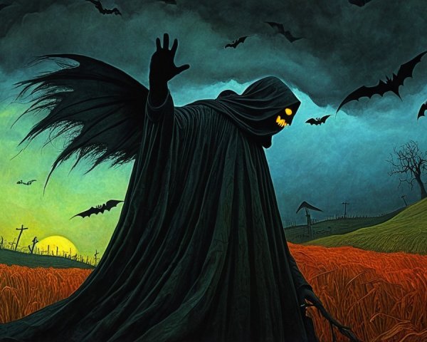 A dark, eerie figure cloaked in shadows stands in a spooky landscape, with glowing eyes and bats flying overhead. The background features a harvest field and a menacing sky, enhancing the Halloween vibe.