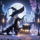 A formidable black dragon stands beside a bubbling cauldron under a full moon, with a medieval castle in the background. Candle flames flicker, casting an eerie glow on the snowy landscape.