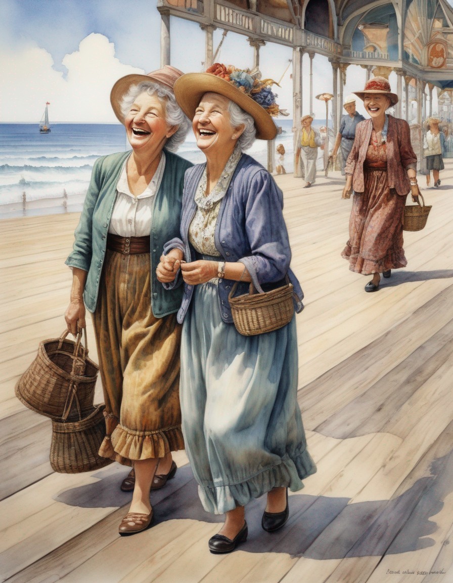 Two elderly women in vintage dresses laugh joyfully at an amusement park, with a carousel in the background.