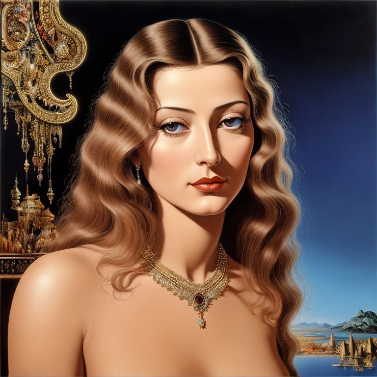 A painting of a woman with wavy hair, red lipstick, and an ornate necklace against a night sky and cityscape background.
