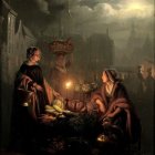 He found it on a narrow street in Leiden, where a lantern cast a warm amber glow over two sisters who sold fruit each night. Annetje, calm and observant, wore dark green wool; Lijsbeth, quicker in movement and temper, wore burgundy. Their baskets overflowed with grapes, melons, and winter apples, glowing softly against the dusk.