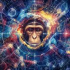 This vibrant artwork features a monkey's face amidst a kaleidoscope of swirling colors and geometric patterns, blending realism with abstract artistry for a striking visual experience.