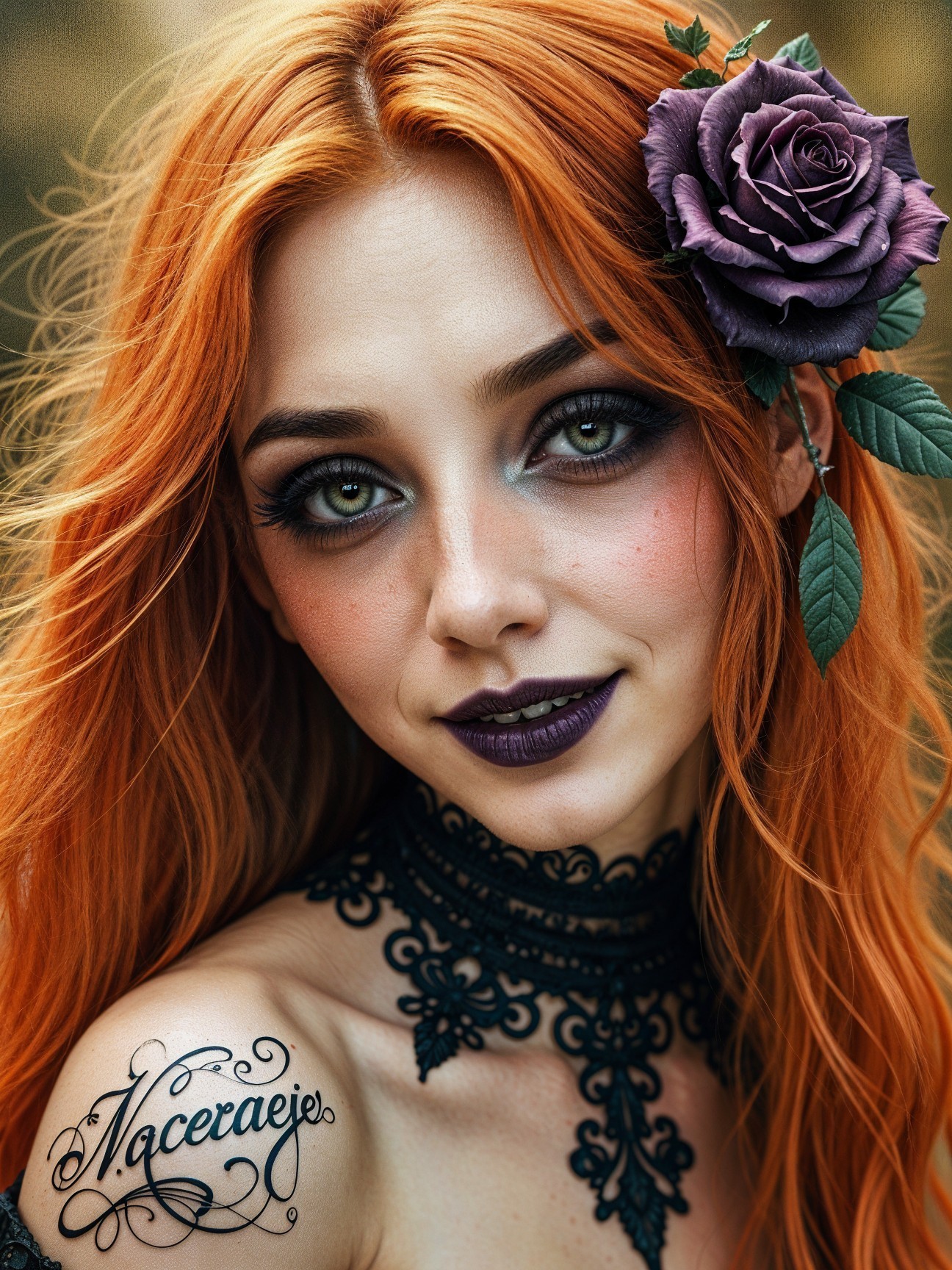 A striking portrait of a woman with vibrant orange hair adorned with a purple rose. She has dramatic makeup with dark lips and intricate lace tattoo, exuding a bold, artistic vibe.