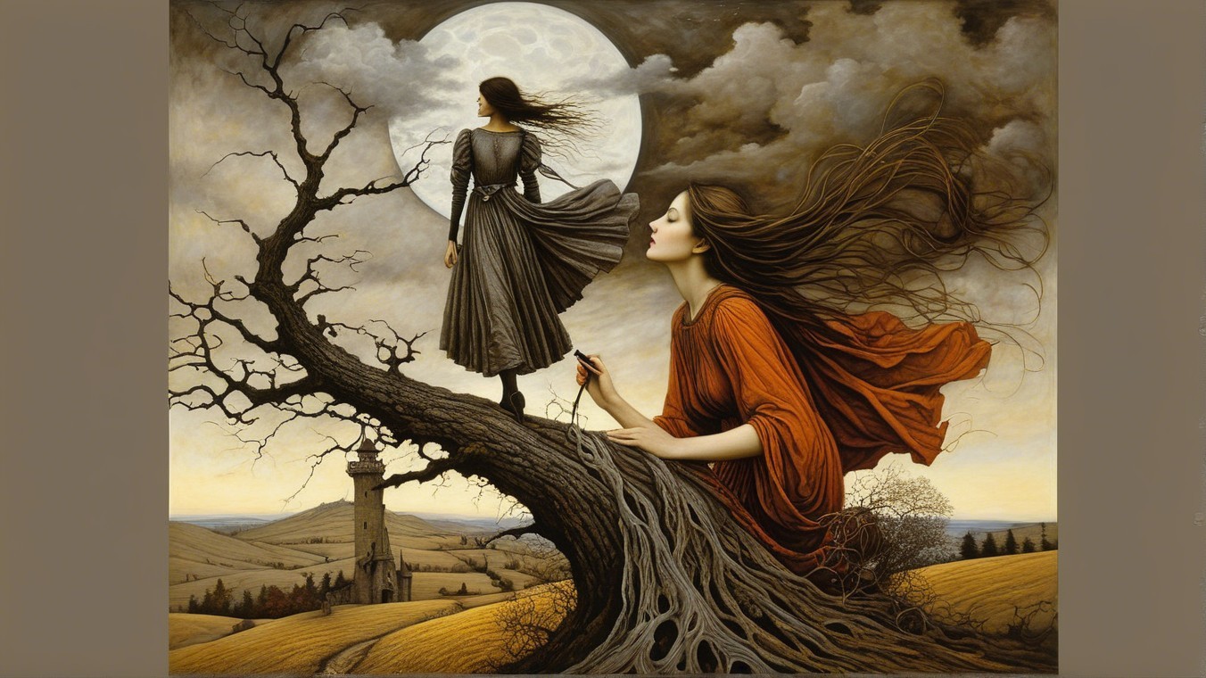 A serene woman with flowing hair stands amidst a landscape, her head adorned with a house and bare trees. A full moon illuminates the sky, while birds and a horse add to the tranquil scene.