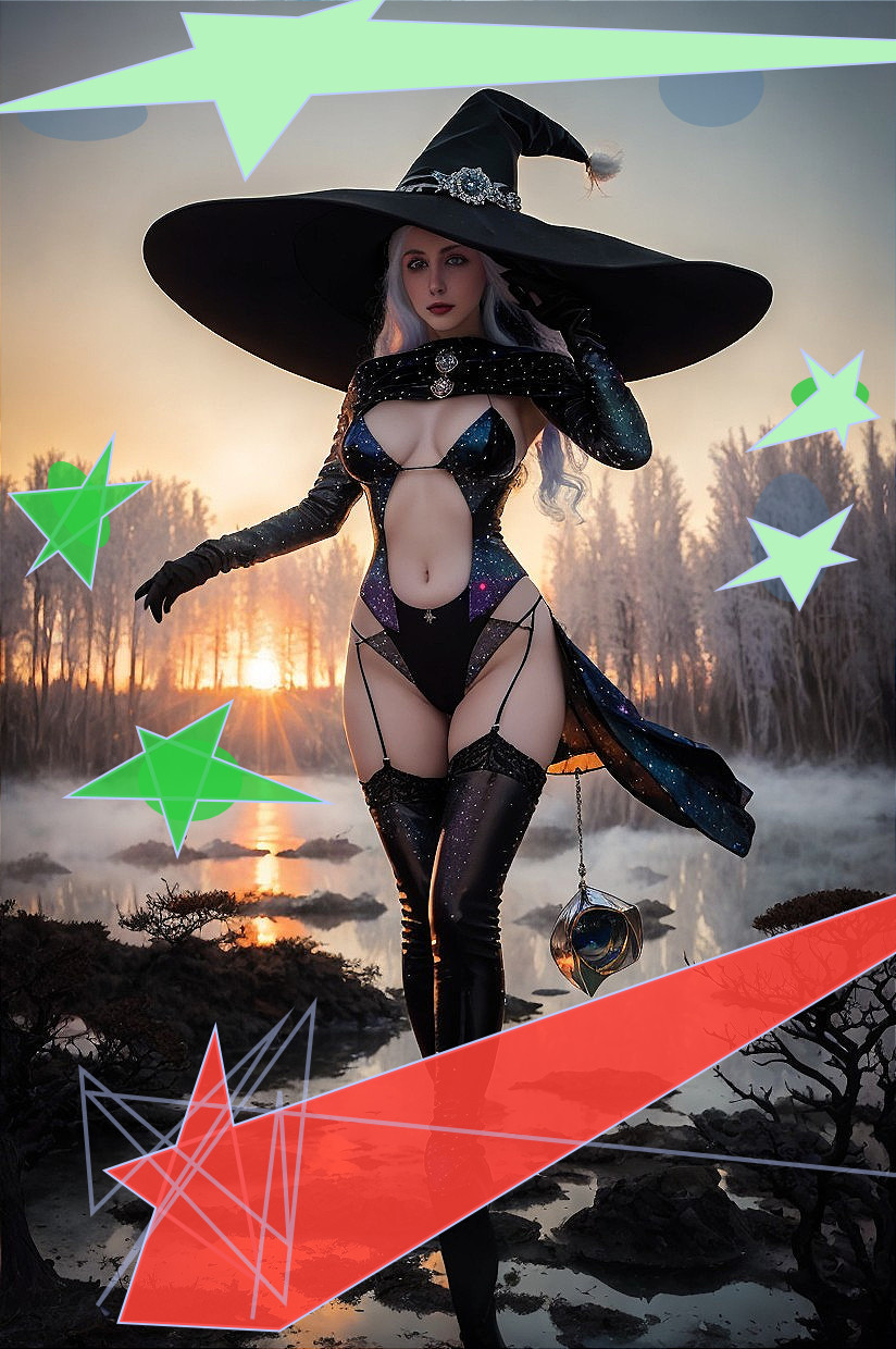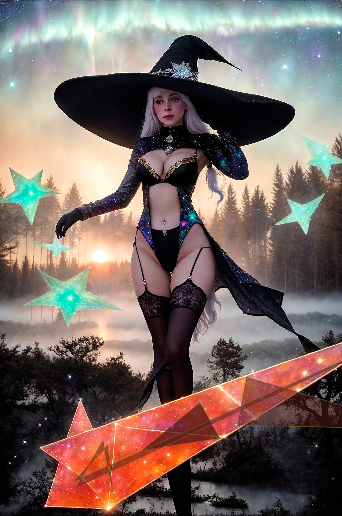 A digital artwork of a fantasy witch with a large hat and star-themed attire, surrounded by glowing stars, against a misty forest backdrop.