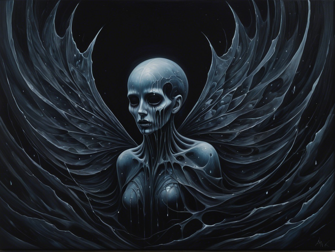 A stunning figure adorned in an intricate blue butterfly-themed gown, complete with large translucent wings. The dark, snowy backdrop enhances the ethereal and enchanting atmosphere.