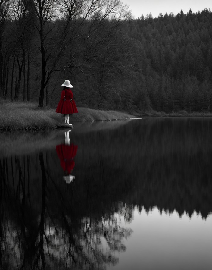 A solitary figure in a striking red dress stands by a tranquil lake, reflecting softly in the water. Surrounding trees and hills create a serene, monochromatic backdrop.