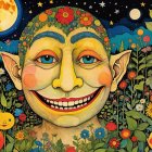A beautifully illustrated woman adorned with floral face paint, wearing a patterned headscarf. She is surrounded by vibrant flowers and curious cats, under a glowing moon.