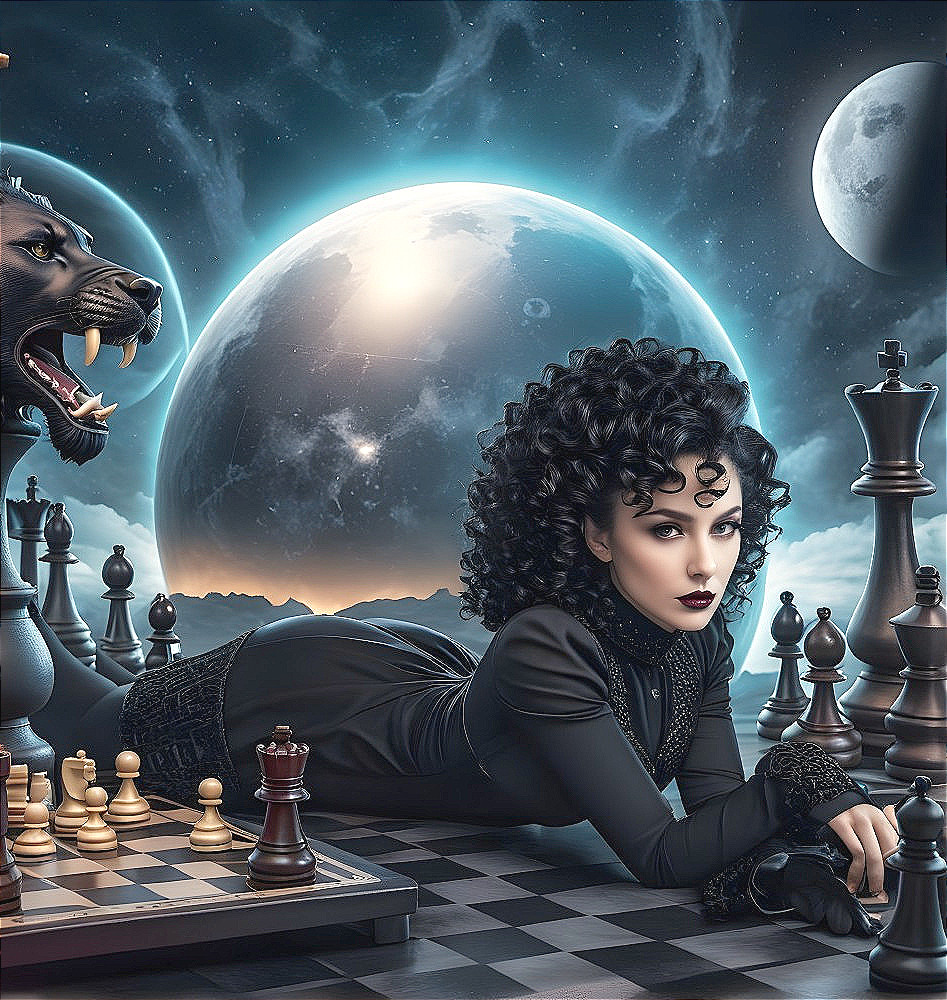 A woman with curly black hair lies beside a chessboard, set against a cosmic backdrop featuring planets. A fierce dog’s head emerges from the left, enhancing the dramatic and surreal atmosphere.
