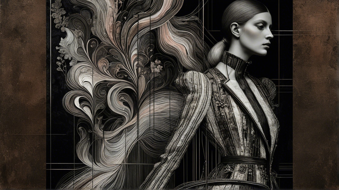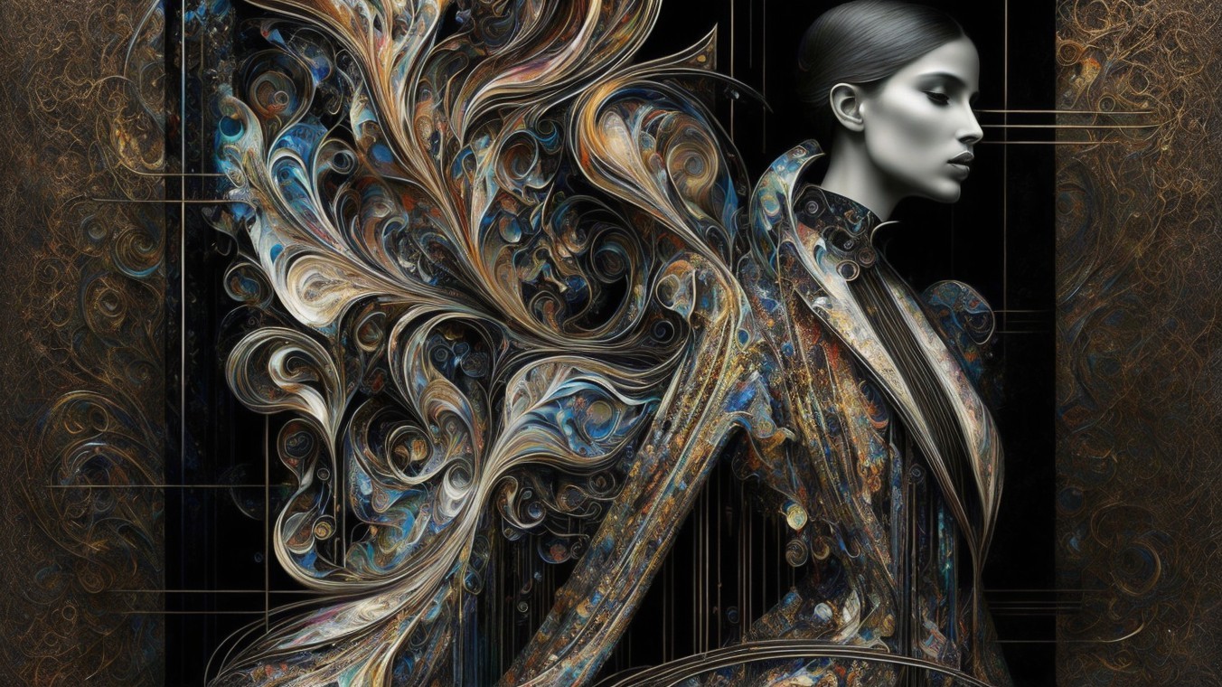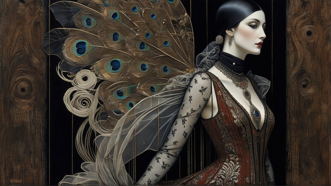 The image features an elegant figure with a dramatic butterfly wing. She wears an ornate, golden dress adorned with intricate details, exuding a sense of grace and sophistication against a dark background.